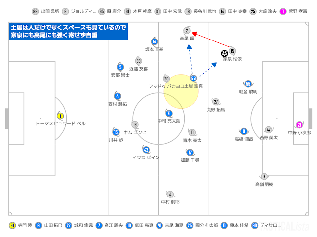 - 山形の視点では、左は坂本がワイドを1人で対応するということで、低い位置で安部のサポート(ワイドにパスコースを作る)のと、前線でウイングの仕事を両立するのがなかなか大変そうな印象でした。